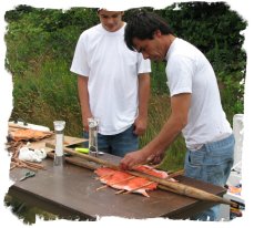 The road out to the cape is being paved, and the Makah tribe offers a free shuttle service. Once there, we walked the ½ mile trail to Cape Flattery, which had been greatly improved with a government grant several years ago. The views are every bit as good as I remembered, and Vance was quite excited to spot some Puffins floating in the ocean next to the cape. In contrast to my previous visit, there were quite a few people who had made the trek.On the way back, we spotted a traditional Salmon Bake underway – offered as a tribal fundraiser on the grounds of the Makah Cultural Museum. Using cedar sticks to hold the fish, the salmon was slowly baked over a driftwood fire. The father of the family offering the bake was a fisherman, and the salmon had been freshly caught just a few hours before. He would prep the salmon for baking in front of us – it was quite interesting to watch him trim the fat from the fish and spread the filets on the interleaved cedar sticks for baking.